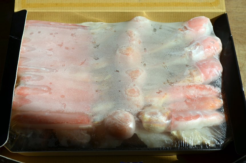 届いたカニがこんなカンジやね。これが2980円送料込みってメッチャナイスやと思う。