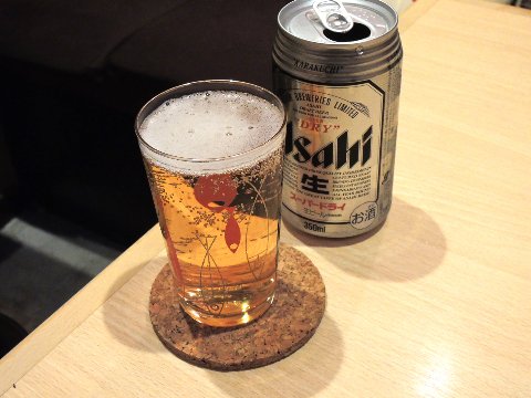 メニューはこんなカンジやね。朝の11時から夜まで通しでやってるんがナイスや。5時前ぐらいやってんけど、カウンターには他に お客さんもおった。人気店かもしれん。えーっと、何故かとりあえず「ビール」500円やね。よう飲むなあ。