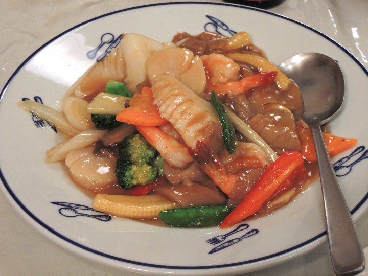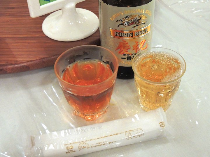 えーっと、とりあえず「瓶ビール」やね。お茶も持ってきてくれた。このキリンの瓶ビール、「慶祝」って書いてあるなあ。今って中国の お正月の時期なんかなあ??? 節分やからかもしれん。それと「炒三鮮(海の幸と野菜の炒め)」1900円!!!