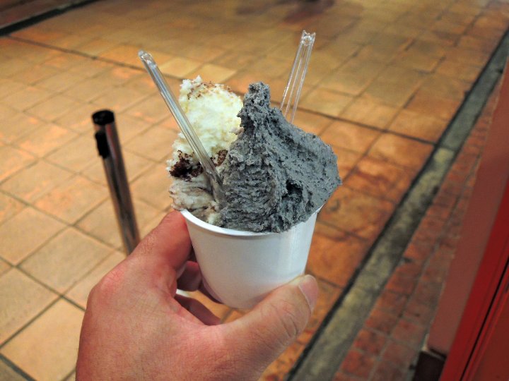 選んだのは「ティラミス」と「ごま」やね。いつもこれを選んでるような気がしないでもない(笑)。相変わらずメッチャうまいなあ。値段は なんぼやったか忘れた。たぶんダブルで400円ぐらいやと思う。これ持ってオリエンタルホテルが見える方に移動や。