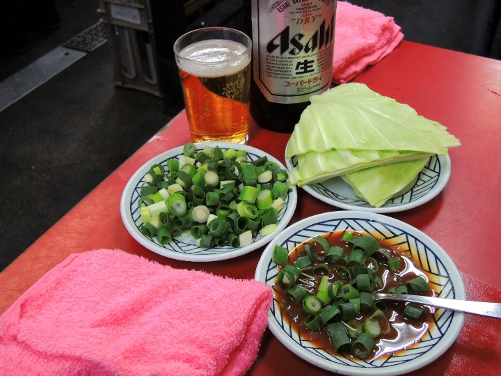 相変わらずナイスな雰囲気やなあ。9時40分ぐらいに着いた。10時がラストオーダーやね。えーっと、とりあえず「ビール」600円!!! いつものタレとネギとキャベツが来た。これがイヤにうまいねん。何故かこれがホンマにイヤにうまい。