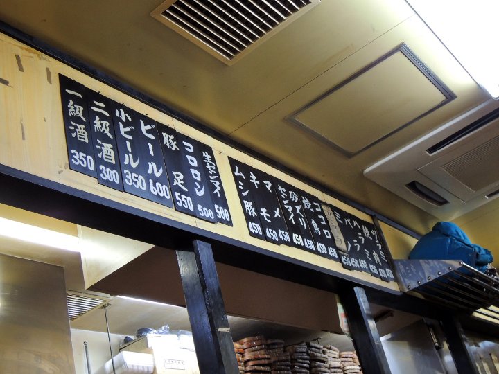骨取った食べやすいヤツを取ったら睨まれた(笑)。どないやねん。エエがな。確かにメッチャうまいわ。えーっと、さらに「熱燗一合」 やね。たぶん一級酒の方やと思う。350円って書いてある。それと「ハラミ」450円、「しょぼくれ」450円、「焼鳥」450円が来て、最後の ラストオーダーの時に「焼肉」450円と「ムシ豚」450円をいっといた。