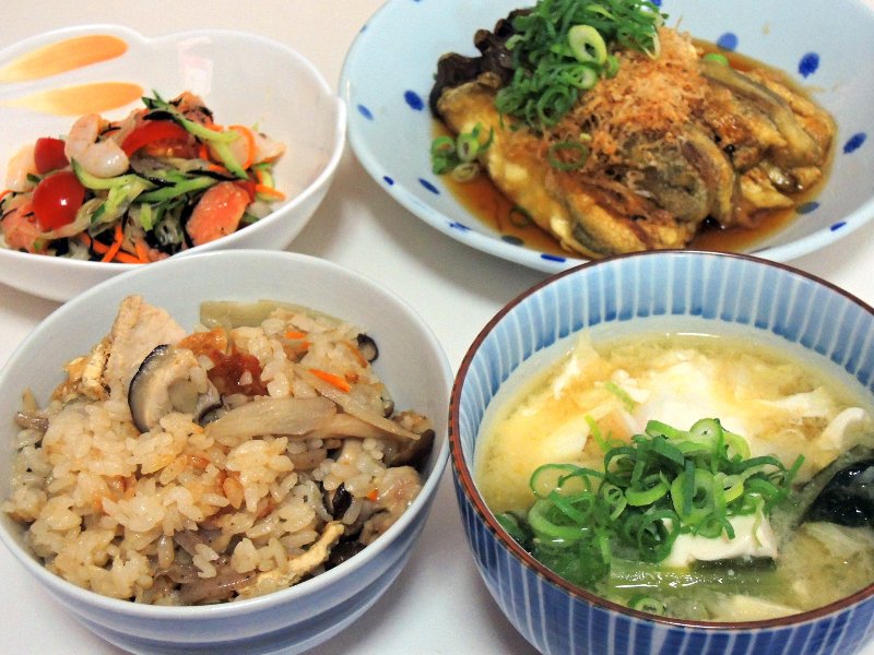 今日は鶏の炊き込みごはんも作ってくれた。それに焼き茄子やね。いやあ、ホンマにメシがうまいわ。ヨメさんにするには心配で かなんけど、家事手伝いセックス担当には最高かもしれんなあ(笑)。料理はなかなかセンスがある彼女やわ。。。