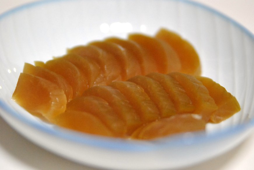 割と色が薄いねんなあ。もっと濃い色を連想してた。実際に食べてみると、実に味が濃い!!! いやあ・・・・・・・、この奈良漬メッチャ