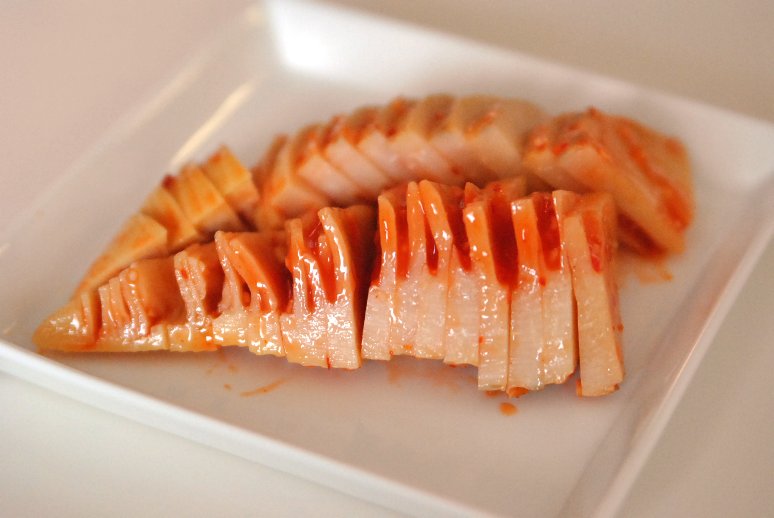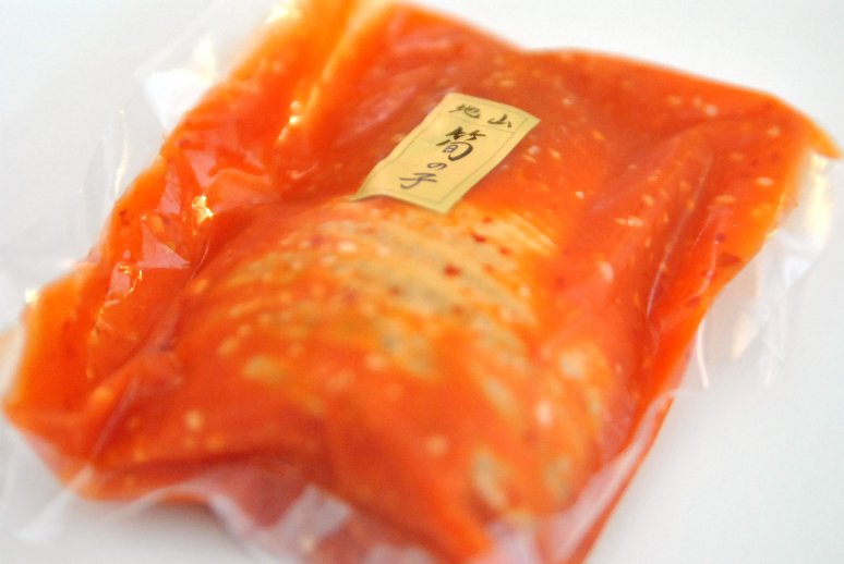 真ん中でスパッと切って、後はザクザク切ってあったわ。ナイスな切り方や。ちょっと酸味が強めかなあ。竹の子の水煮にこのキムチの
