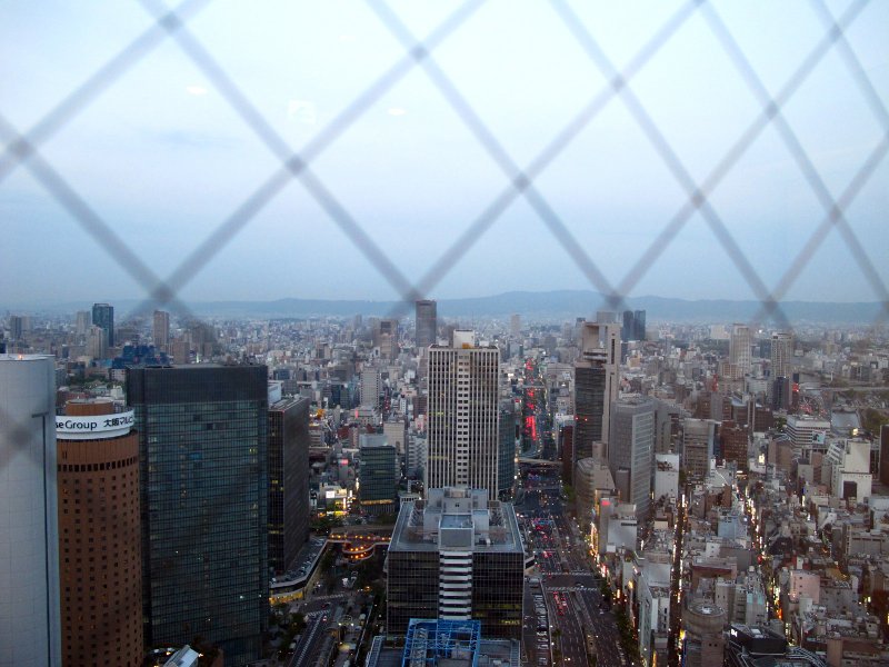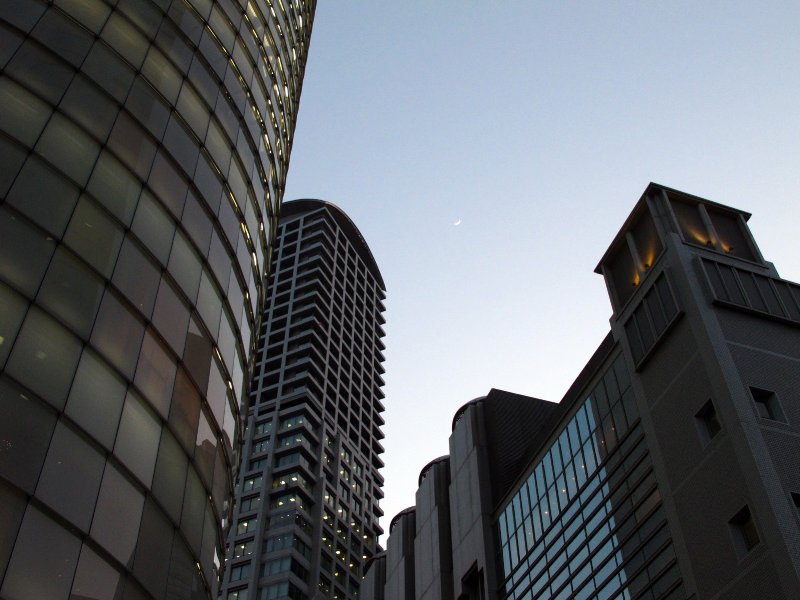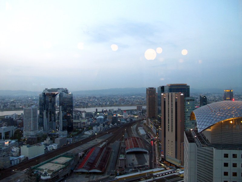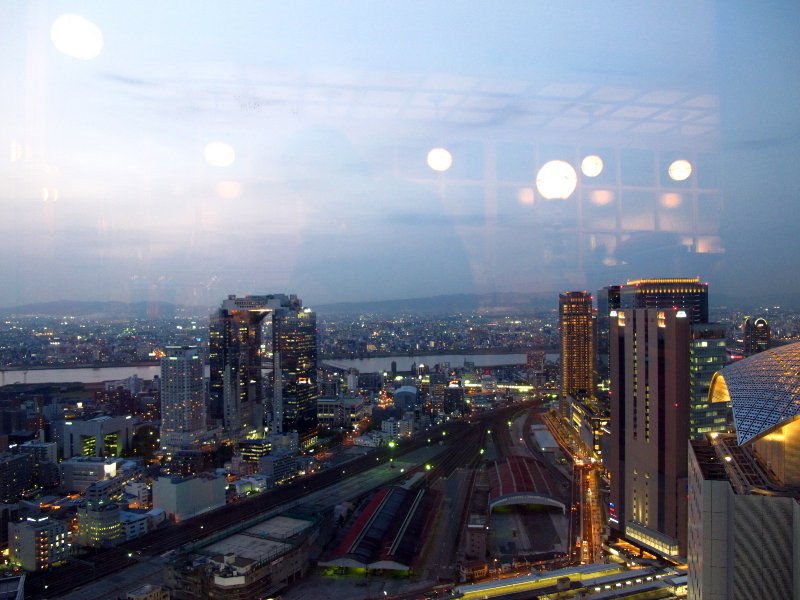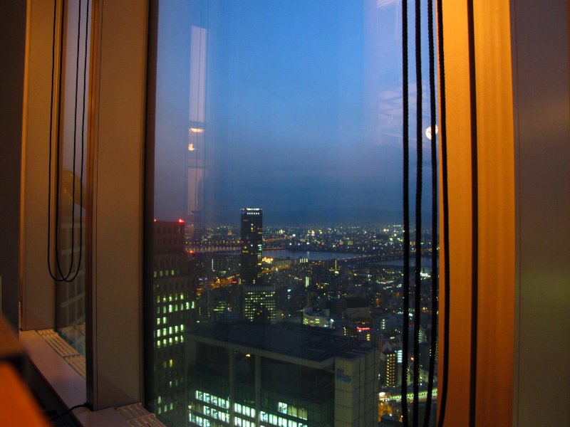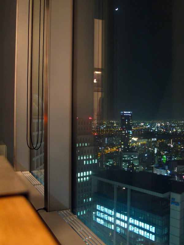オモテは真っ暗になって、夜景がメッチャ綺麗になってきた。お月さんも見えるなあ。ホンマにサイコーのロケーションやなあ。下に 見えるダイビルも懐かしいわ。リッツカールトンの部屋から見た事があった。実に懐かしい。