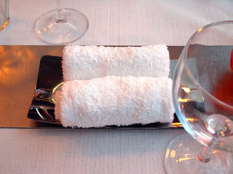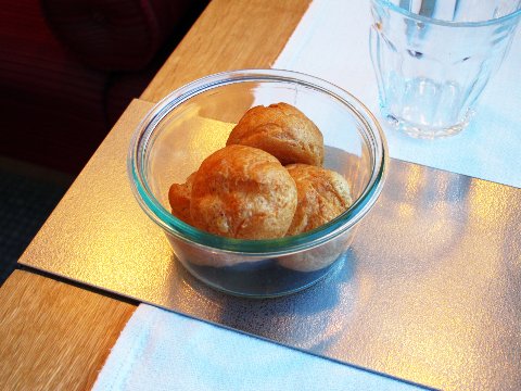 思いっきり景色の良いレストランやった。広さもハンパやあらへん。100人以上入れるんとちゃうかなあ。実に思いっきりガラガラ やったけど・・・・・・・。まあ忙しかったらこんなサービスはせんよなあ。ワインを選んでたら付き出しのシュークリーム!?みたいなんが 来たわ。それと温かいおしぼりやね。