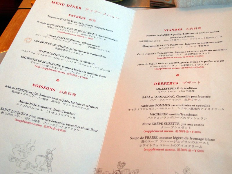 このシュークリームは中にクリームが入ってなかった。こんなんあるねんなあ。メニューはこんなカンジやね。今回は前菜を二種類、 メインを一種類、デザートを一種類選べるコースやった。実に悩むなあ。それにしても景色が綺麗やわ。