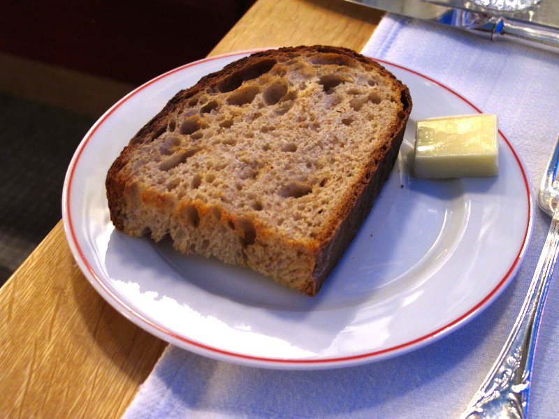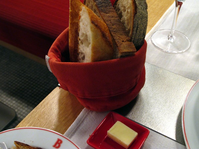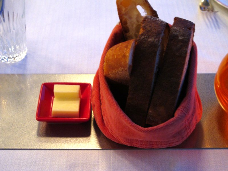 メッチャスッキリした白ワインやったわ。これでも2250円は安いなあ。長堀ダイナーより安いやん(笑)!!! サンブリっていうのは 地区の名前みたい。シャブリ地区のすぐ近く。定価は4500円かあ。まあそれでも良心的やと思う。パンも来たわ。
