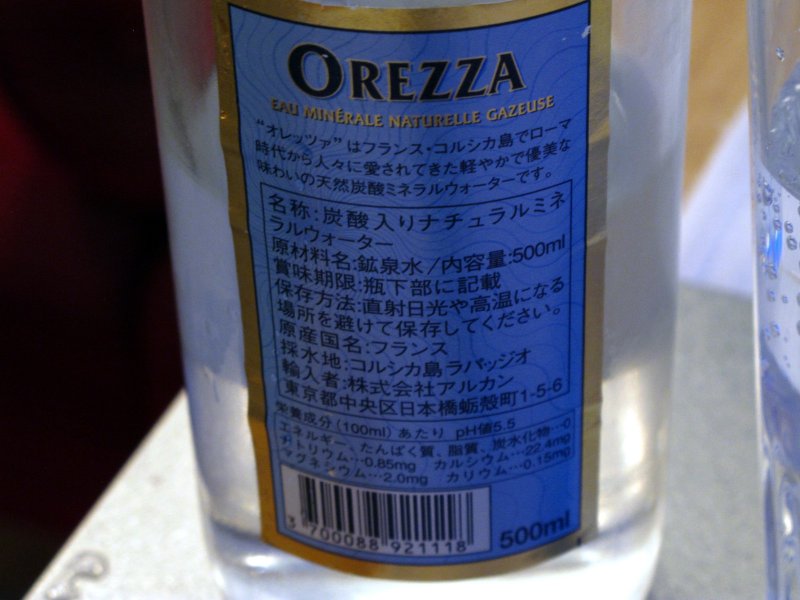 えーっと、ガス入りの水ももらった。「オレッツァ」750円!!! フランスのコルシカ島で取水した水みたい。