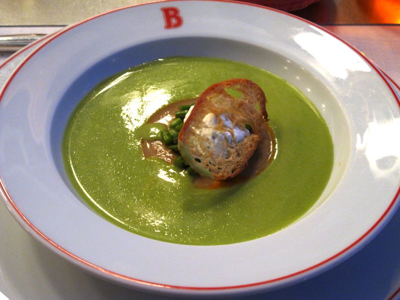 前菜の一品目、オレが選んだのは「グリーンアスパラガスのスープ “ヴルーテ” 甲殻類のロワイヤル」!!! それから彼女が 選んだのは「鶏白レバーのテリーヌ」!!!