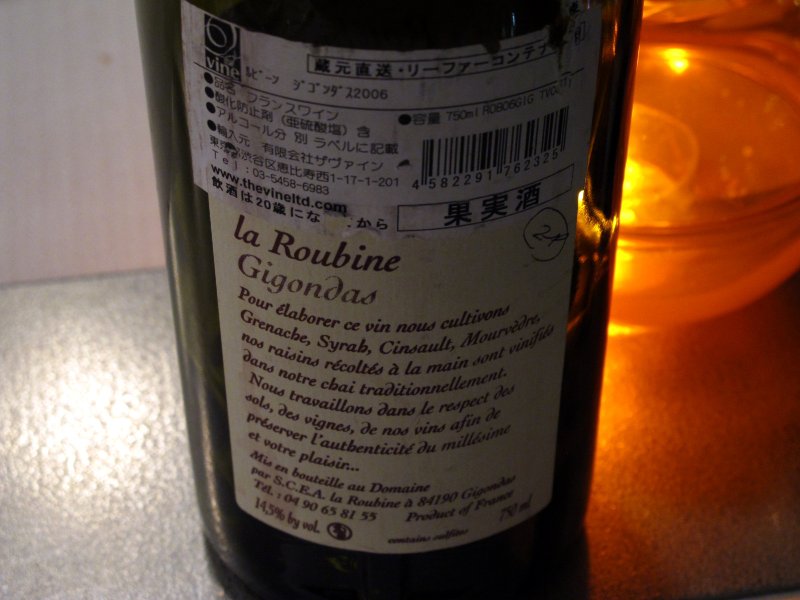 やっぱりこの自家製のパンはうまいなあ。タマランぐらいうまい。この自家製のパンも赤ワインは合うと思う。えーっと、選んだ 赤ワインは「ルビーン ジゴンダス 2006」9900円→4950円!!!