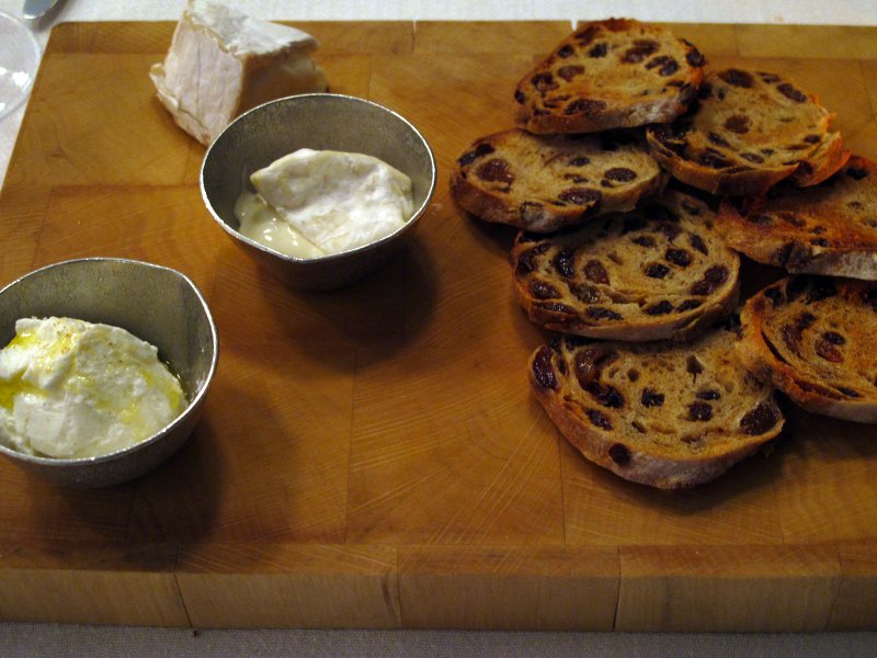赤ワインもまだ残ってたんで、「チーズ盛り合わせ」を3カットで頼んだ。出てきたのは普通のカマンベールとフレッシュなカマンベール、 さらにシェーブルチーズやった。レーズンパンも自家製らしい。