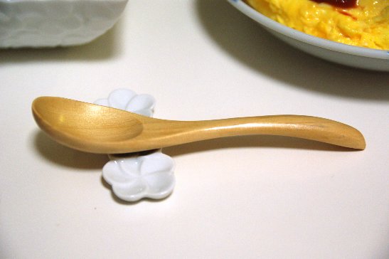 今日はチキンライスを三合炊いたらしいんで、オムライスを作ってくれた。トマトも安かったらしい。3個で198円か何か言うてへん かったっけなあ。この前、キューズモールで買った木のスプーンも出てきた。