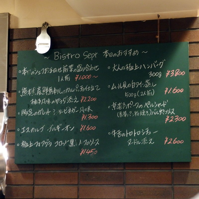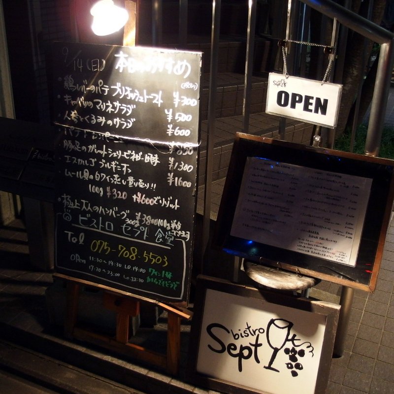 まあそんなカンジで今日の晩メシは、烏丸にある「ビストロ セプト」!!! 通りがかりでこの黒板と目が合うてんなあ。お店は 2階にあったわ。洒落たカンジの外観やね。