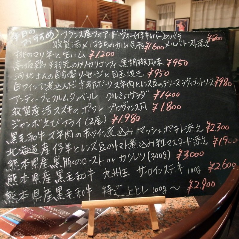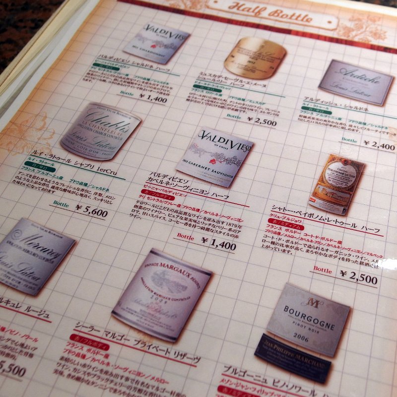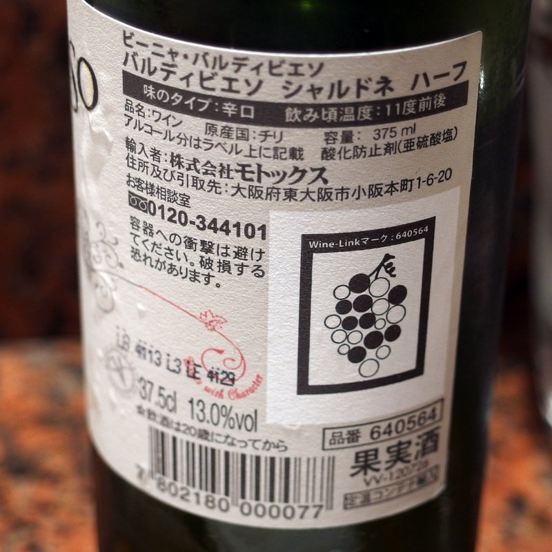 なかなかにエエカンジのお店やね。メニュー見るまでが楽しみやねんなあ。えーっと、とりあえずハーフボトルがあったんで それをいっといた。「バルディビエソ カベルネ・ソーヴィニヨン」1400円を注文してんけど、何故か白のシャルドネが来た。 もう抜栓してあったんで、それでいいわ〜って言うてもらった。