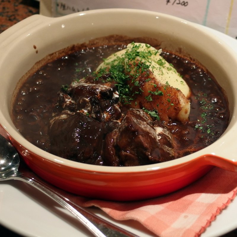 そんでメインが来た。「黒毛和牛スネ肉の赤ワイン煮込み マッシュポテト添え」2300円と「プチメックさんのバケット」 350円!!! バゲットはこの煮込みを見て注文した。この料理にはバゲットが要るわ。