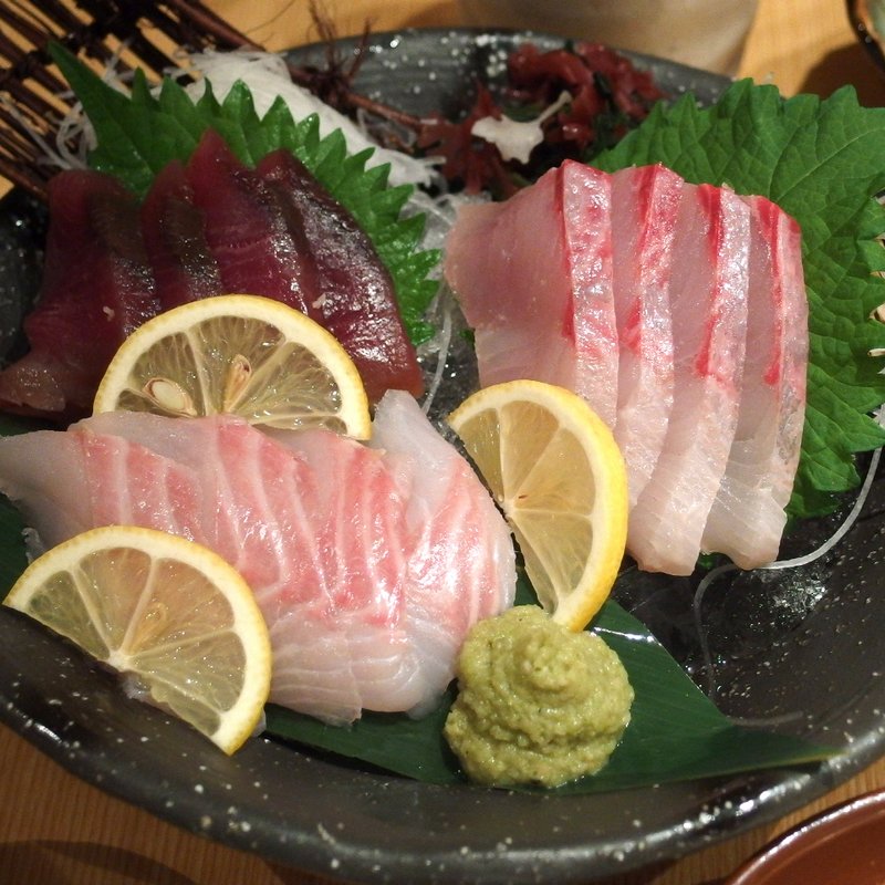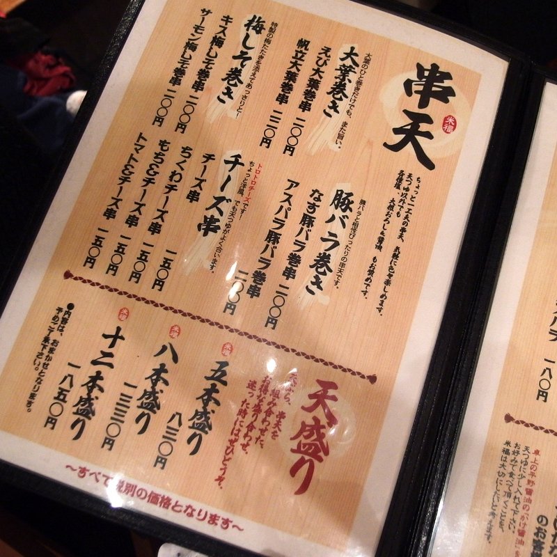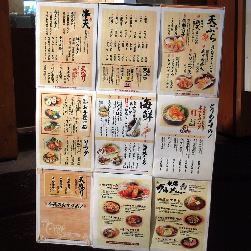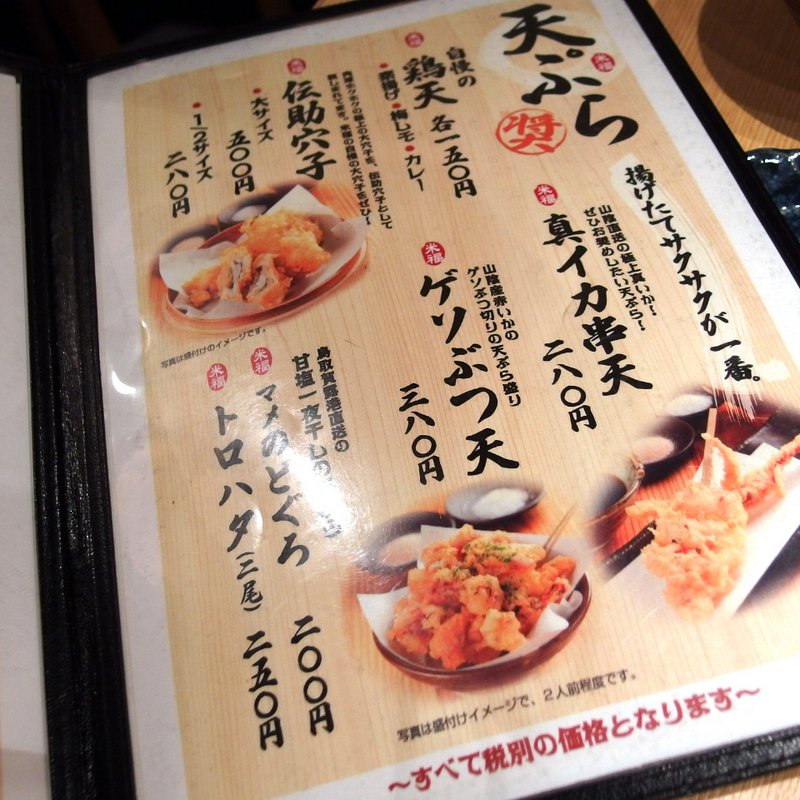 えーっと、店内に突撃や。天ぷらと刺身がうまいみたいやね。珍しい組み合わせやわ。メニューはこんなカンジやね。