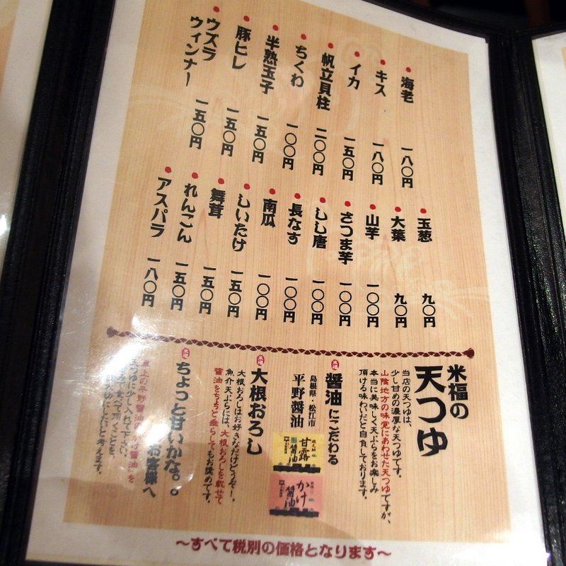 そんでまあまたこの辺をさまよった。最初に行こうと思ってて、混んでたんで諦めたお店に行ってみたら、実に空いてた。 ナイス!!! 突撃やね。「天ぷら 米福」!!!