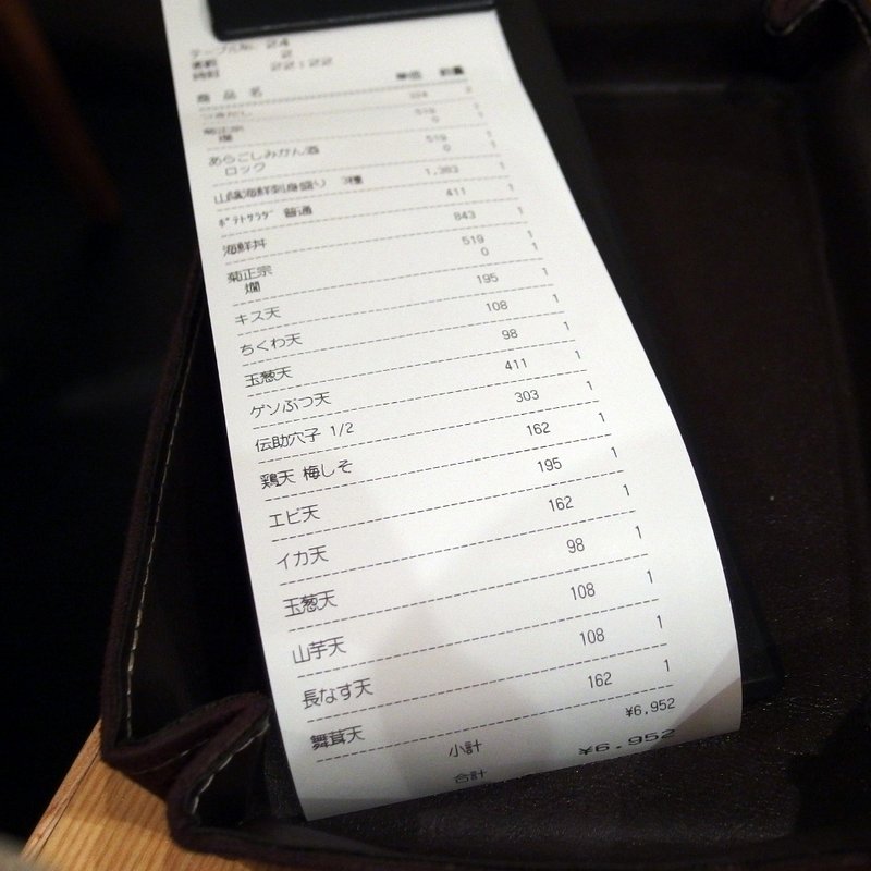 いやあ、さすがにハラパンパンになったなあ(笑)。結構喰ったわ。よう考えたらここ2軒目やもんなあ。熱燗ももう一本 飲んだ。下げてもらうつもりで徳利を渡してんけど、向こうはおかわりと思ったみたい(笑)。なかなかオモロイ展開やった。 魚も天ぷらもこの値段やったらレベル高いわ。お会計はこんなカンジやね。
